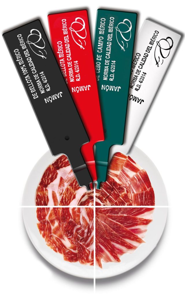 イベリコハムは全て同じ訳ではないので、それぞれを間違いなく識別できるようにするために色付きの封印システムがあります。これにより目の前にあるイベリコハムがどの種類のものなのかを瞬時に分かる事でしょう。